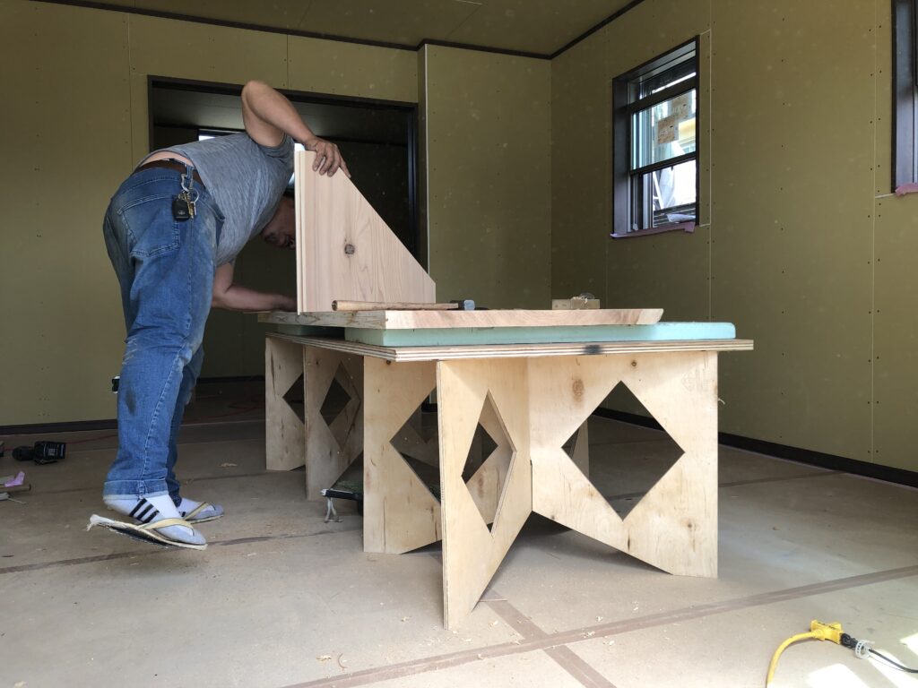 BLOG 伊奈町 平屋の家 伊奈町平屋の家 2021年4月13日 工事は順調に進んでいます。外壁もほとんど完了しました(^-^) 天井の羽目板がとてもきれいです! 大工さんがキッチンカウンターを無垢板から作成中です♪ 木の香り広がる仕上がりがとっても楽しみです!