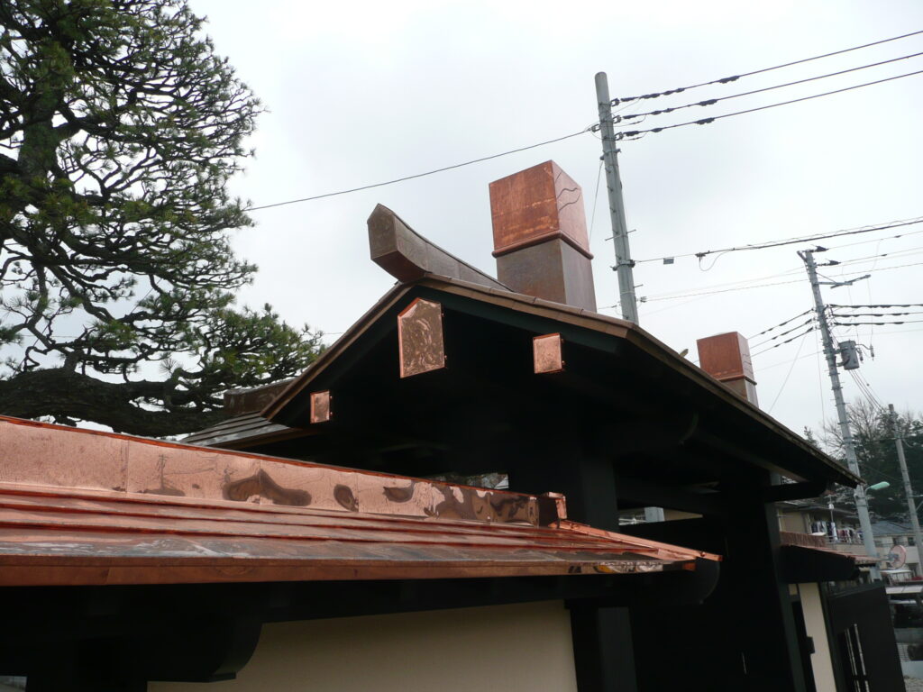 門銅葺き工事をさせて頂きました。大変立派な門構えの屋根は銅葺きが施されていましたが、雨漏れにより軒天の腐食が起きていました。今回は、銅葺き屋根の葺き替え工事、門木部の塗装工事をさせて頂いております。