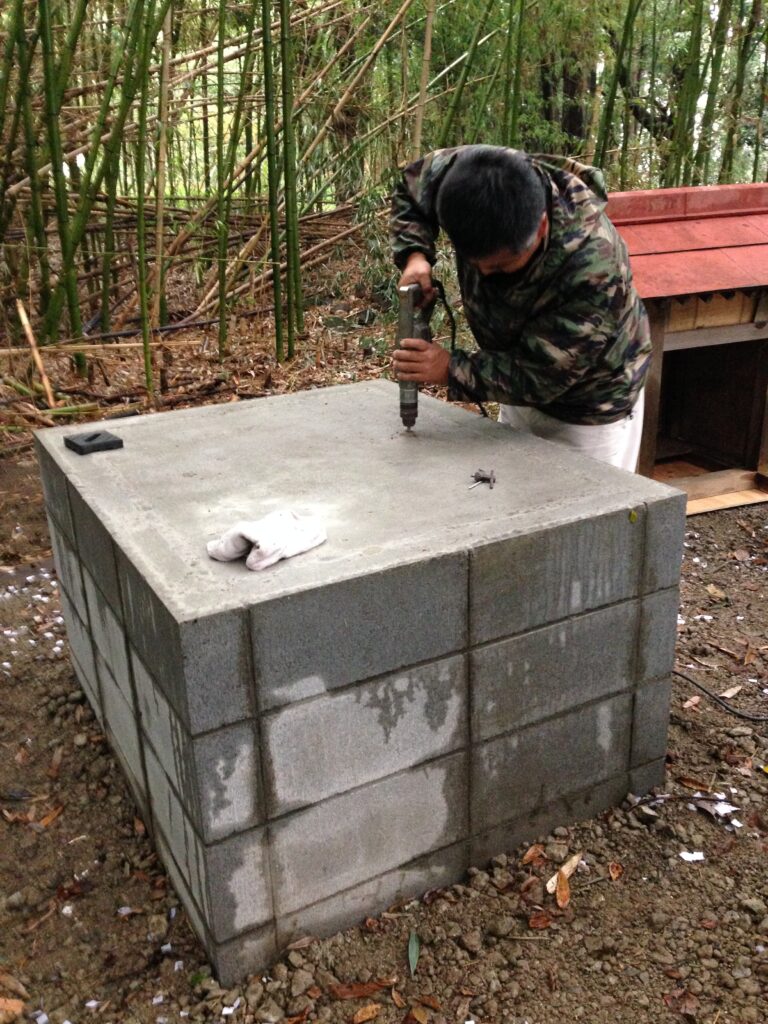 かなり老朽化していることや、大きさ以上に重量が重いこと、また、きつい斜面の上にあるため車が入れないことで、全て手運びでの作業となりました。雨により足場も悪く緊張感を持って作業にあたりました。
