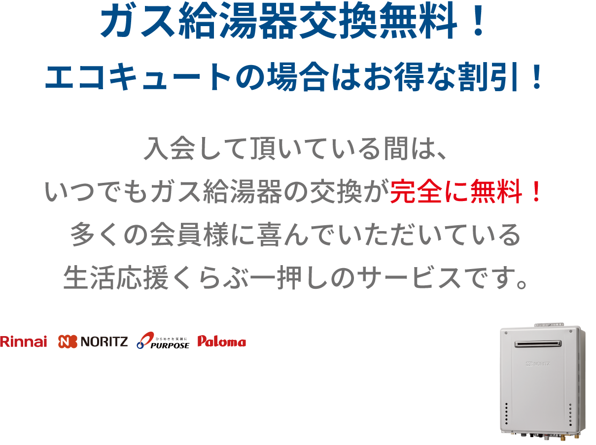 ①都市ガス、プロパンガスに関わらず無料でおこなえますが、ガス種がプロパンガスの会員様は、初回交換時のみジャスティス提携ガス会社への契約切り替えをお願いしています。面倒な手続きは一切ありません。